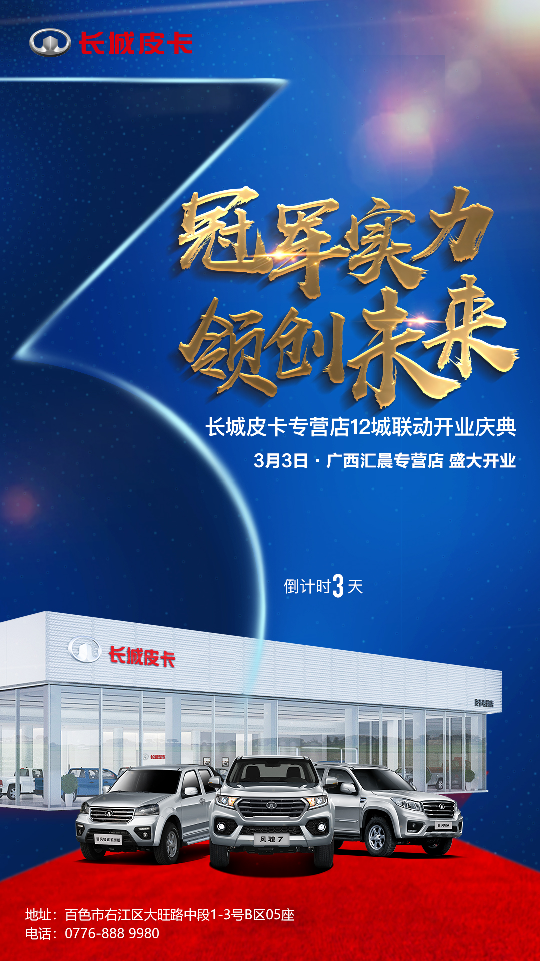 皮卡專(zhuān)屬服務(wù)到來(lái),百色市首家皮卡專(zhuān)營(yíng)店——廣西匯晨皮卡專(zhuān)營(yíng)店將于3月3日開(kāi)業(yè),為皮卡用戶(hù)量身打造一站式無(wú)憂(yōu)服務(wù)! 長(zhǎng)城皮卡廣西匯晨專(zhuān)營(yíng)店的開(kāi)業(yè),一站式解決了皮卡用戶(hù)的從選車(chē)、購(gòu)車(chē)到用車(chē)的需求。皮卡專(zhuān)營(yíng)店的設(shè)立,為廣大皮卡用戶(hù)提供了更便捷、高效、專(zhuān)業(yè)的服務(wù),讓皮卡用戶(hù)真正體驗(yàn)到屬于自己的專(zhuān)屬服務(wù)。另外,專(zhuān)營(yíng)店還將為用戶(hù)提供整車(chē)銷(xiāo)售、精品、金融貸款、保險(xiǎn)、售后服務(wù)等業(yè)務(wù)于一體的專(zhuān)業(yè)服務(wù),為用戶(hù)打造全方位無(wú)憂(yōu)服務(wù)。 此次廣西匯晨皮卡專(zhuān)營(yíng)店開(kāi)業(yè),集合風(fēng)駿5歐洲版、經(jīng)典版、新風(fēng)駿6、風(fēng)駿7等多款長(zhǎng)城皮卡車(chē)型,供不同購(gòu)車(chē)需求的用戶(hù)盡情挑選。專(zhuān)營(yíng)店內(nèi)有專(zhuān)業(yè)銷(xiāo)售人員將為用戶(hù)提供全面的車(chē)型介紹,讓用戶(hù)輕松選擇出最合適自己的長(zhǎng)城皮卡車(chē)型。 2018年,長(zhǎng)城皮卡連續(xù)21年獲得國(guó)內(nèi)銷(xiāo)量、出口雙第一,全球累計(jì)銷(xiāo)量破150萬(wàn)量,長(zhǎng)城皮卡,實(shí)至名歸的國(guó)際化皮卡品牌。 據(jù)悉, 3月3日廣西匯晨皮卡專(zhuān)營(yíng)店開(kāi)業(yè)當(dāng)天,到店用戶(hù)均可享受購(gòu)車(chē)優(yōu)惠(根據(jù)經(jīng)銷(xiāo)商優(yōu)惠活動(dòng)修改),同時(shí)還有精彩節(jié)目和精美茶點(diǎn)。心動(dòng)不如行動(dòng),3月3號(hào)廣西匯晨皮卡專(zhuān)營(yíng)店與你想約,不見(jiàn)不散。 廣西匯晨 長(zhǎng)城皮卡專(zhuān)營(yíng)店 電話(huà):0776-888 9980 地址:百色市右江區(qū)大旺路中段1-3號(hào)B區(qū)05座(交安檢測(cè)站路口) |