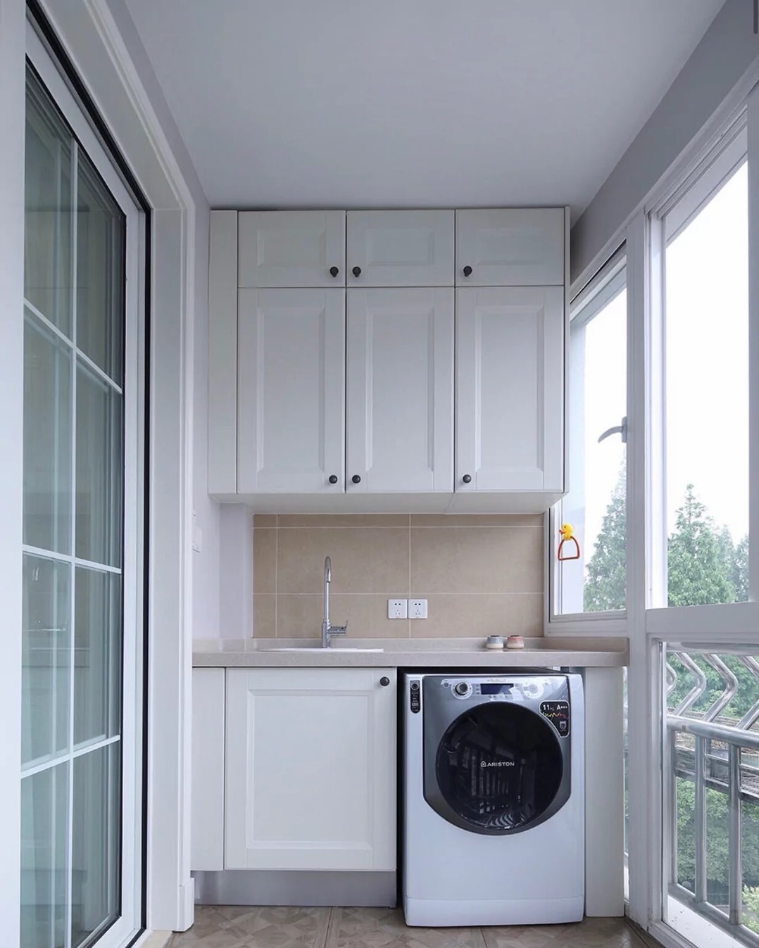 此時將成品洗衣柜往陽臺一放,就已經(jīng)達(dá)到陽臺使用要求了,其它的就不管了。這樣不僅白白浪費(fèi)了陽臺價值十多萬的空間,同時在使用上也并沒有達(dá)到讓生活更加方便。
